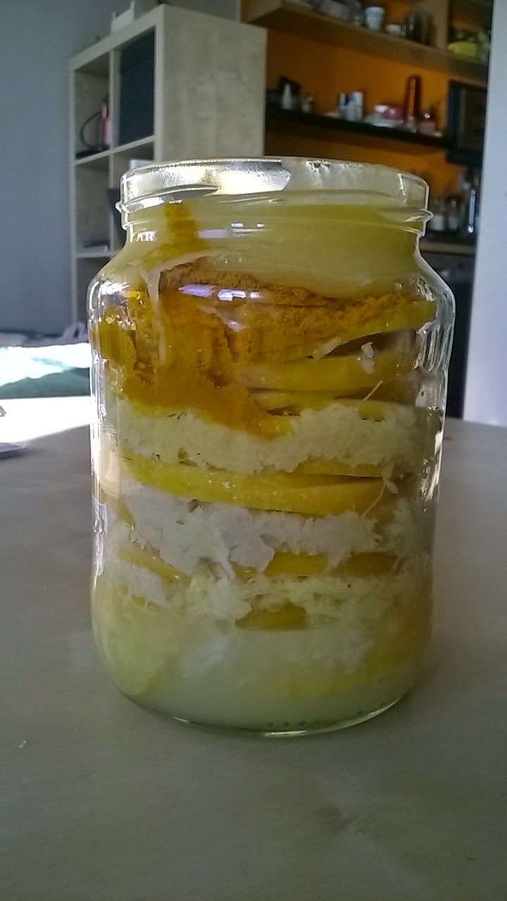 1.) Най-напред приготви лимона. Ако нямаш достъп до екологични, домашни лимони, ще трябва да ги подготвиш, защото ще използваш целия плод – с обелките. Измий ги хубаво, след което ги залей обилно с вряща вода (за да се разпуснат восъчните консерванти). Отново ги изтъркай и накрая ги накисни за 5 минути в топъл, наситен разтвор на сода бикарбонат (добавяй сода за хляб в топла вода, докато започне да се утаява без да се разтваря). Лимоните са готови – нарежи ги на филийки.